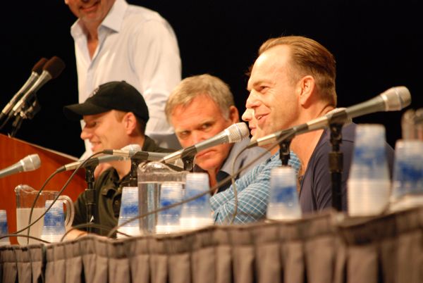 Captain America, selon son sous-titre, est le First Avenger. Il était donc normal qu’il passe en premier, lors du grand panel Marvel. Et en plus, le réalisateur, Joe Johnston, n’est pas venu les mains vides ! Une grosse surprise, puisque le tournage, pour l’acteur principal du film, Chris Evans (Captain America), a débuté il y a seulement 5 jours. Premier temps fort : la projection d’une très courte vidéo, un teaser, montrant des images d’archives de la Seconde Guerre Mondiale (1941), avec la voix du président Franklin D. Roosevelt. « Nous devons créer la plus belle armée de l’histoire. Et chaque armée commence avec un homme. » Les couleurs du drapeau américain se rapprochent pour former un bouclier. Une silhouette de profil, est visible, dans l’ombre, très brièvement. Il s’agit de Captain America. « L’été prochain, rencontrez le Premier Vengeur ! ». Son bouclier vole vers le public. Fin du teaser.