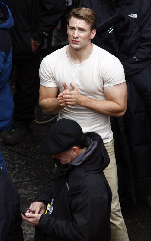Voici un article qui demande du temps, et surtout une bonne dose d’organisation ! Le tournage de Captain America se poursuit en Angleterre, et c’est l’un des moments clef de l’histoire de Steve Rogers qui vient d’être filmé ! Depuis deux jours, les caméras de Joe Johnston se sont posées afin de tourner des séquences d’action dans une rue de Brooklyn (mais nous sommes en réalité à Manchester). Explosions, fusillades, course-poursuite… Et bizarrement, les protagonistes sortent tous d’un magasin d’antiquités ! Brooklyn Antiques : une simple boutique ? Pas tout à fait, puisque ce magasin sert de couverture à l’Opération Renaissance, visant à transformer un homme normal (Steve Rogers) en super-soldat (Captain America)… Les scènes tournées en ce moment se situent donc juste après la transformation de Rogers en Captain America. Tous ceux qui connaissent les comics savent qu’à l’issue de l’expérience, un espion nazi abat le docteur Erskine (créateur du projet). Il est donc logique de penser que dans les scènes actuelles, montrant les personnages de Steve Rogers (Chris Evans) et Peggy Carter (Hayley Atwell), il y a confrontation entre les héros et des espions nazis… Ce sont les premières photographies et vidéos qui nous permettent de découvrir Chris Evans dans son personnage (ainsi que Hayley Atwell en Peggy). Pour m’être plongé hier dans la saga « Captain America Reborn », je trouve que Chris Evans colle parfaitement au personnage ! Mis à part ses pieds dignes d’un hobbit (un accessoire assez comique pour faciliter la course dans la rue), il est définitivement Captain America ! Voici donc les différentes séquences de tournage (vidéos et photos), de façon quasi chronologique.