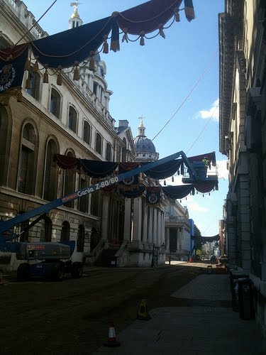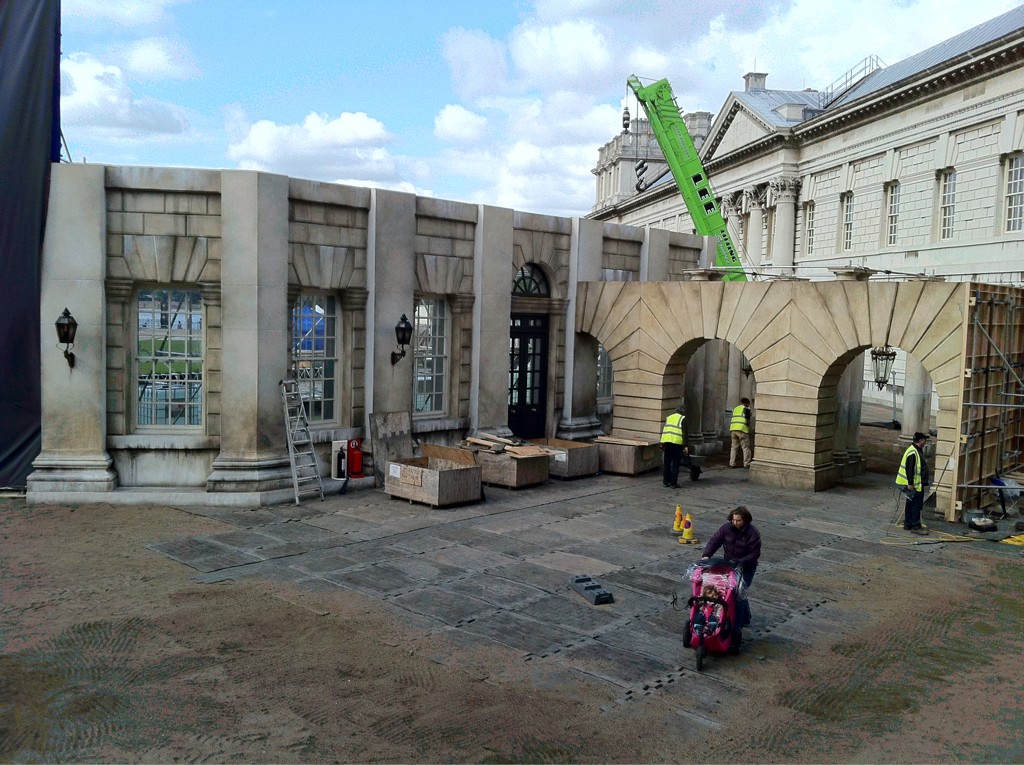 Pendant que le producteur Jerry Bruckheimer amuse la galerie en postant sur son compte Twitter une photo de son chien (?) découvrant les premières images des nouvelles aventures de Jack Sparrow (la chance !), le tournage du film de Rob Marshall se poursuit, aujourd’hui même, en Angleterre. Le cadre est unique et magique, puisqu’il s’agit de l’ Old Royal Naval College de Greenwich, une bâtisse historique magnifique. L’immense plateau est complètement bouclé, difficile de savoir ce qui s’y produira, si ce n’est la présence de nombreux chevaux sur place (une parade militaire ?). Une visite du tournage en photos, et en vidéo !