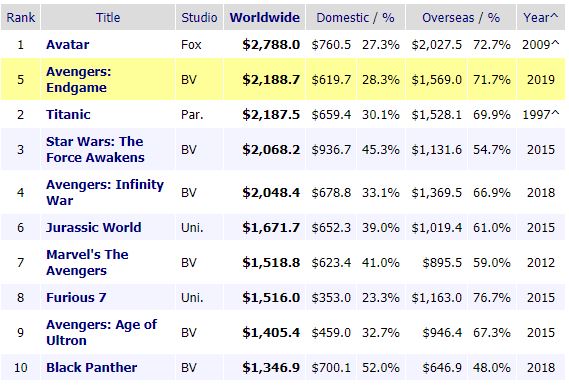 Aussi c'est toujours possible qu'il dépasse le record de 2e weekend de SW-TFA aux US. Ça serait bon signe pour qu'il tape au moins 800 millions ! Dépasser SW aux US semble vraiment très compliqué, c'est une bataille de tous les jours pendant quelques semaines pour que Endgame le fasse :lol: