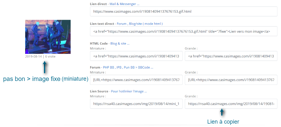 Ensuite, je n'aime pas les sites comme casimage car c'est "la galère" pour récupérer les liens. Car même quand tu sais quoi copier, il n'y a pas de bouton de copie rapide par exemple. Et quand tu copie le lien pour forums, ils t'en mettent un qui ouvre une page avec le nom du site.. enfin bref.