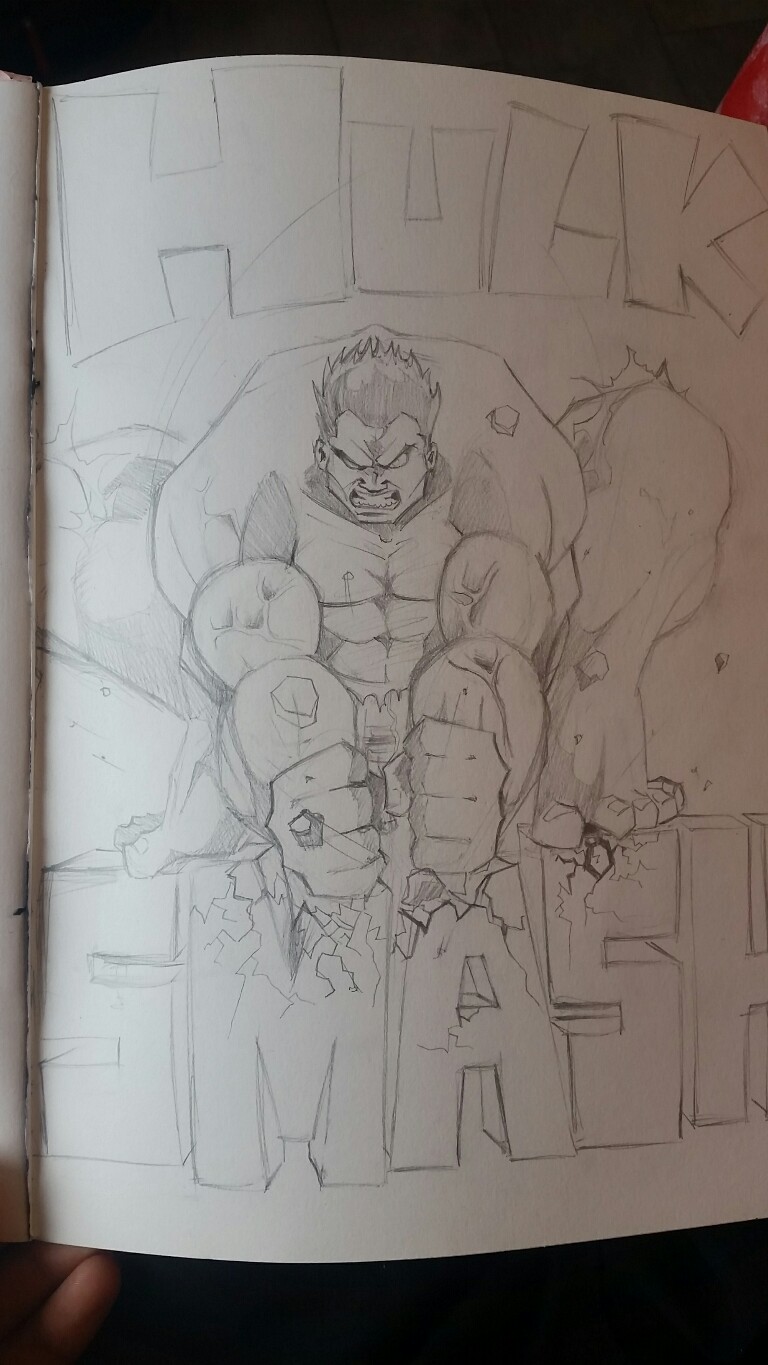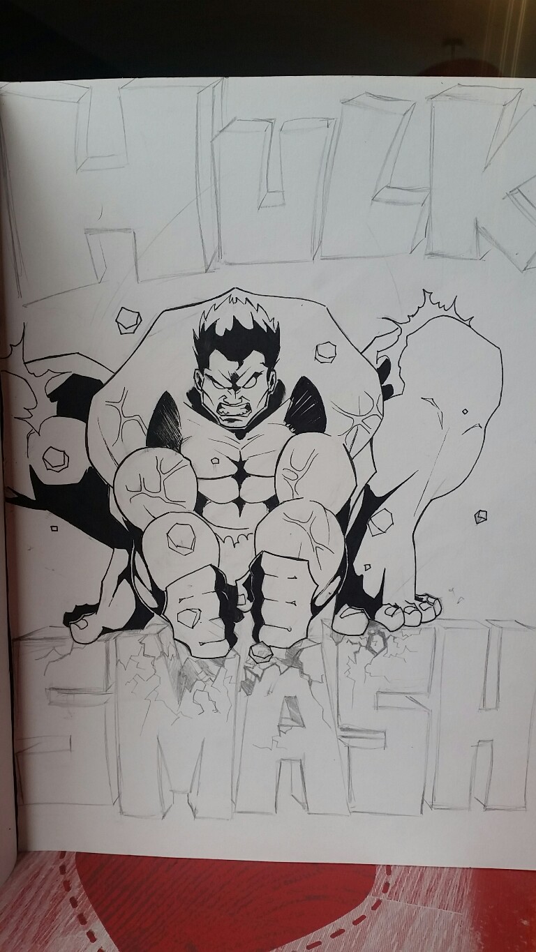 J'ai retouché le croquis en augmentant la masse du corps de hulk + début d'encrage !