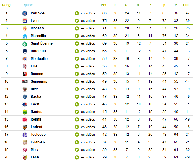 Coté classement, Monaco, Marseille et Saint Etienne se disputeront la 3éme place lors de la dernière journée, alors qu'Evian, tout comme Metz et Lens sont rétrogradés en Ligue 2.