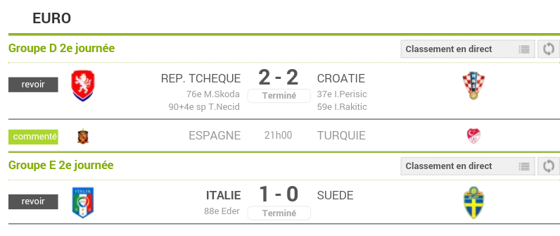 Pu voir qu'une mi temps de Rep' Tcheque vs Croatie, tout à l'heure méme chose pour Espagne vs Turquie.