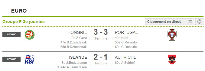 Ce final de groupe F etait completement fou, les Hongrois finissent 1ers, les Islandais 2emes (joueront l'Angleterre) et le Portugais 3emes (joueront la Croatie).