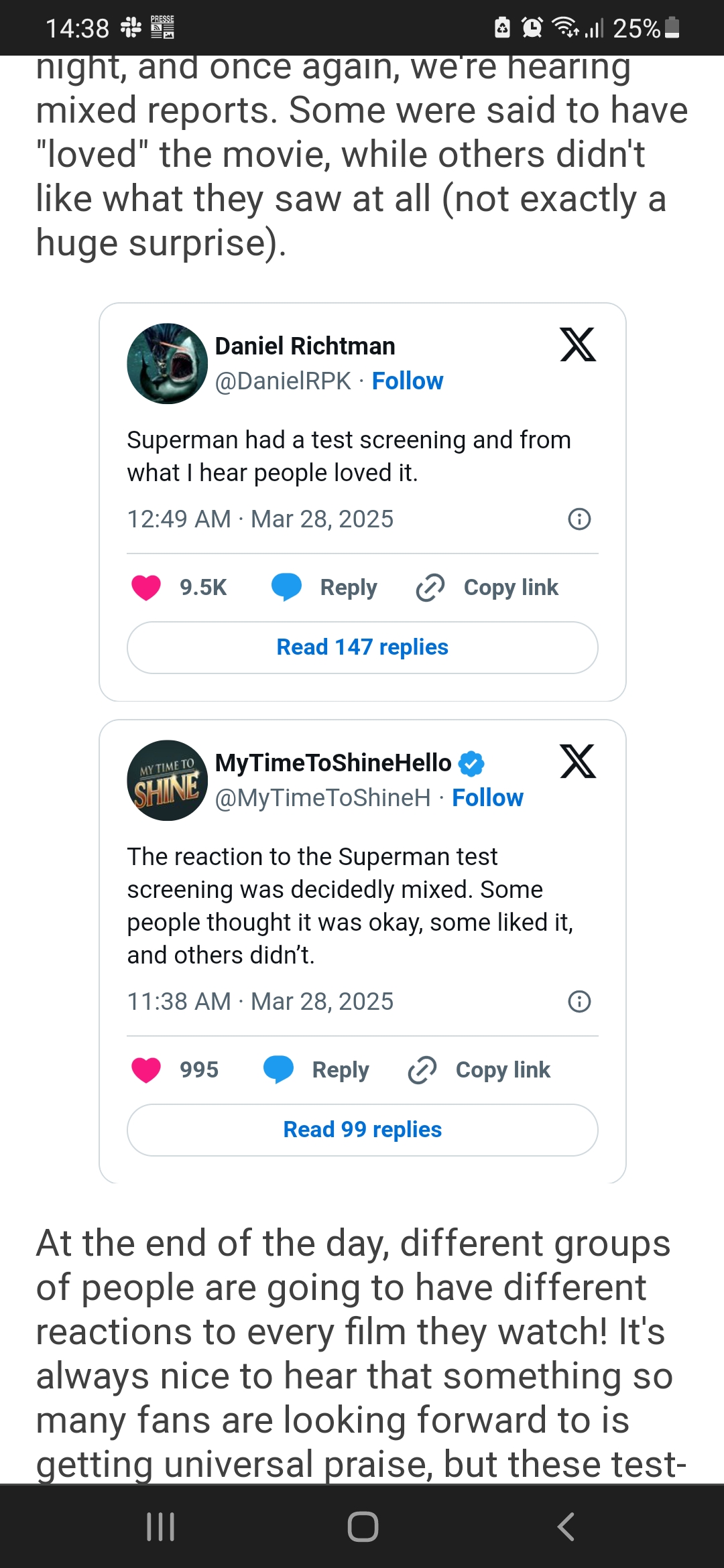 "I got a recent test screening report from somebody who saw it and, yeah, they liked it. They thought David delivered as the Man of Steel. They thought Gunn did a good job balancing the heart and humour, and they said it's around 140 minutes approximately."