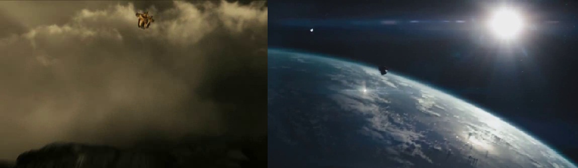 La scene n'est pas sans rappeler celles, dans le trailer 3 et le spot TV 3 de Man of Steel, dans lesquelles on voit Superman fournir de gros efforts pour voler, et celle dans laquelle il plane dans l'espace durant une seconde, juste avant de plonger a tres haute vitesse vers la terre -- la encore, clin d'oeil a la meme scene dans Superman Return ou Brandon Routh fonce vers la terre.