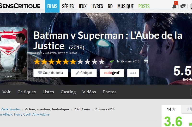 tu veux dire le film qui devait être un Man of Steel 2 puis qui a été retardé d'un an et demi, auquel on a greffé Batman puis Wonder Woman afin de préparer non sans mal un univers partagé et enfin concurrencer Marvel avec un film super-héroique d'équipe ? Le sous-titre purement marketing DoJ n'est arrivé qu'après hein... Et pareil à chaque fois pour DC c'est "nan mais attendez la director's cut vous verrez ce sera moins pire", à tel point que tout le monde en rigole aujourd'hui (surement du voir ça chez Screen Junkies ou une connerie du genre). Les retours qu'on m'a fait d'ailleurs sur celle de BvS c'est qu'effectivement c'est moins pire mais pas encore ouf ouf !