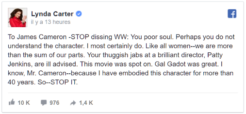 La réponse de Patty Jenkins a écrit:"James Cameron's inability to understand what Wonder Woman is, or stands for, to women all over the world is unsurprising as, though he is a great filmmaker, he is not a woman. Strong women are great. His praise for my film Monster, and our portrayal of a strong yet damaged woman was so appreciated. But if women have to always be hard, tough and troubled to be strong, and we aren't free to be multidimensional or celebrate an icon of women everywhere because she is attractive and loving, then we haven't come very far have we. I believe women can and should be EVERYTHING just like male lead characters should be. There is no right and wrong kind of powerful woman. And the massive female audience who made the film a hit it is, can surely choose and judge their own icons of progress."