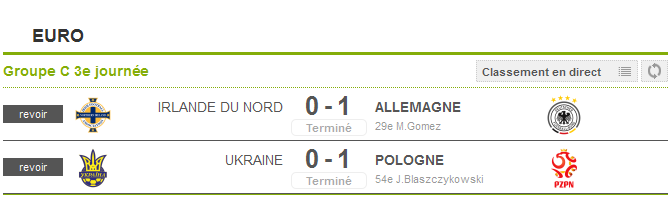 L'Allemagne aurait pu/du gagner par 3 buts d'écart minimum, mais ce score permet à l'Irlande du Nord d'espérer faire partie des meilleurs 3émes...les Polonais se sont aussi qualifiés, ils affronteront les Suisses.