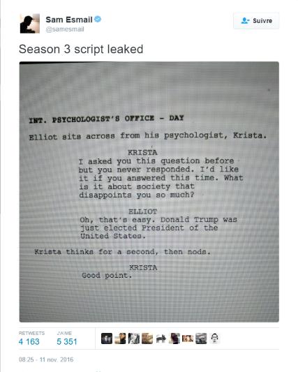 Mr. Robot est une représentation du monde d'aujourd'hui, en mettant l'accent sur ses défauts, certes, et qui peut faire peur, mais bon faut se faire à l'idée que notre monde n'est pas celui des Bisounours.