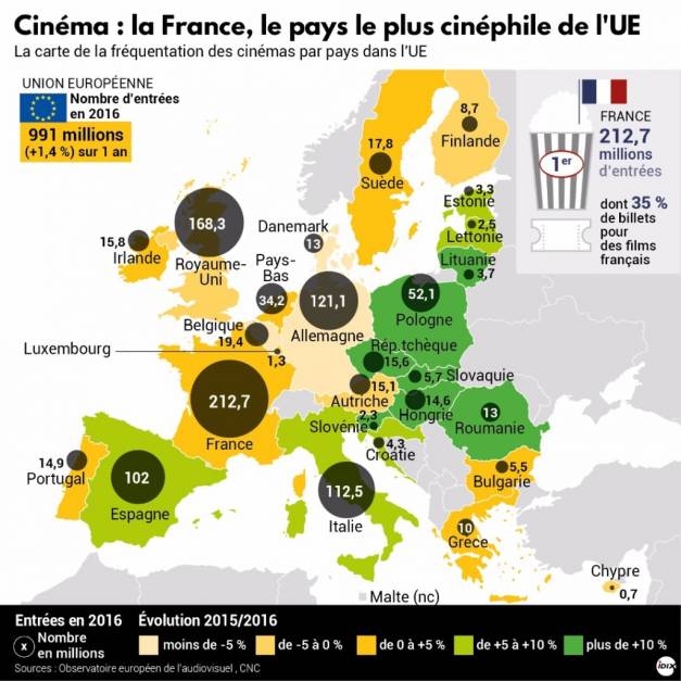 Dans le coin haut droit, c'est marqué que 35% concernent des films Français, après effectivement on a un "gros" film français qui sort pas tous les ans (Les Beaufs 3 cette année), mais quand même. Il y a en France un attrait certain pour le cinéma étranger (américain?) et Français.
