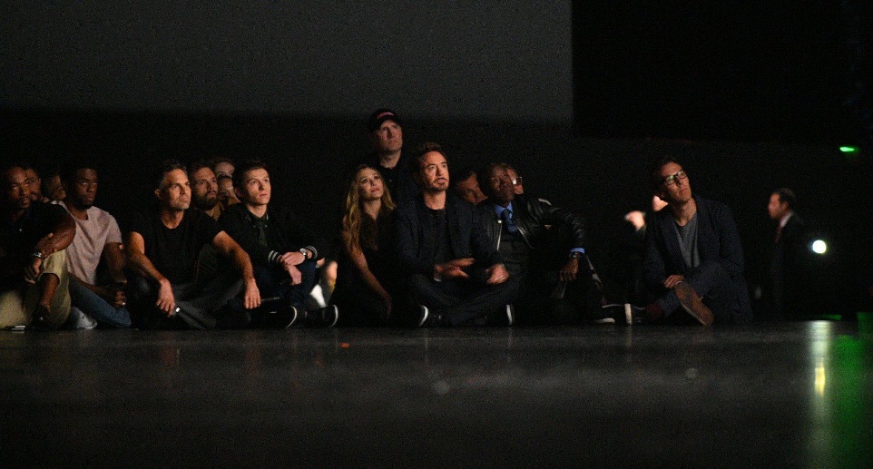 "Un combat commence. Le docteur Strange pose des plates-formes et Star-Lord les saute, tire son fusil. Couper à Spider-Man,dans son nouveau costume révélé à la fin de Homecoming, sautant dans les airs. Un coup de vision derrière les barreaux. Un tir d'une armée Wakandan qui comprend Bucky. Captain America sort de l'ombre avec une barbe pleine. La veuve noire est montrée avec des cheveux blonds. Iron Man a une nouvelle armure très élégante. Quelqu'un utilise l'armure Hulkbuster. Juste un montage énorme de coups de feu.