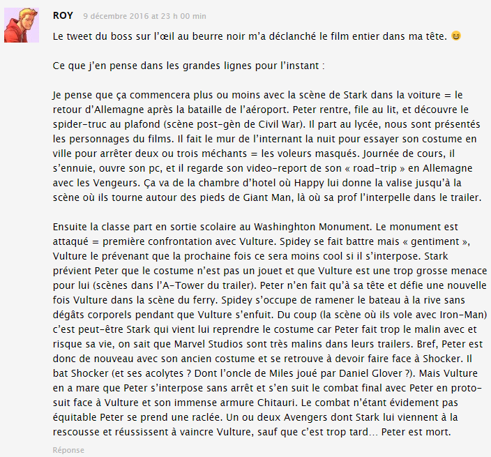 En fait, tel que c'est parti, je me demande si on va pas avoir simplement : Stark qui dénonce Spider-Man aux autorités par rapport aux Accords de Sokovia.