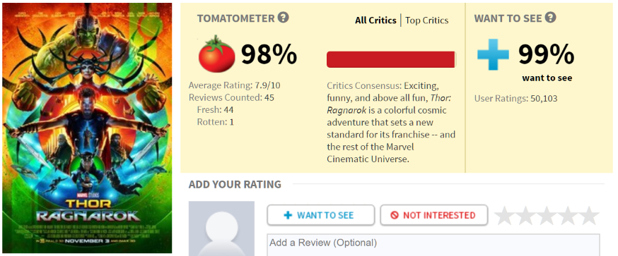Je ne suis pas du tout d'accord avec ce que tu dis sparky4. Si un film plait autant à un grosse partie du monde comme ça, ça veut surtout dire que dans 90% des cas il est ultra formaté. Et ce sera le cas de Thor : Ragnarock comme ça a été le cas avec Wonder Woman. C'est pour ça que des films ultra formatés de ce genre se retrouvent avec des meilleures notes qu'un Nolan. Suffit d'écouter ce qui passe à la radio et qui fait un carton aux divers événements musicaux pour comprendre...