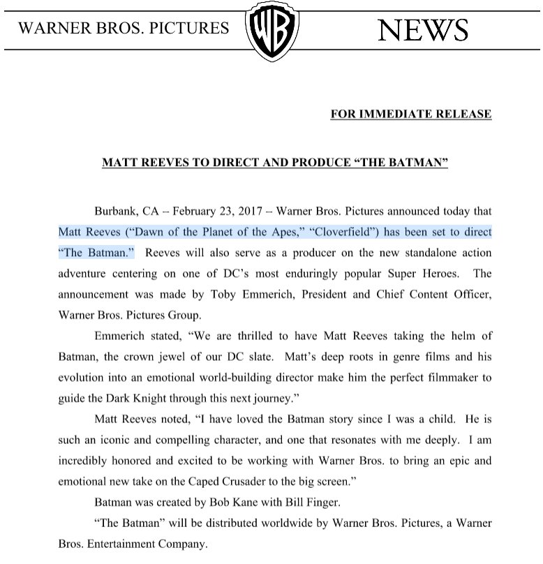 Fin de la récré Matt Reeves réalisera et produira le film .Communiquer intégral de la Warner a suivre .