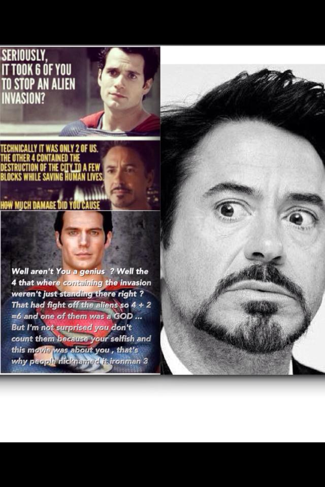 superman: toi t'es un génie? les quatre qui cantonner l'invasion rester planter la ? ils combattais les alliens alors 4+2=6 et un des votre est un dieu mais sa m'étonne pas que tu ne l'es comptes pas parce que tu es égoïste et que le film tournait sur toi c'est a cause de sa que les gens l'ont surnommé iron man 3 (il parle de the avengers bien sur )