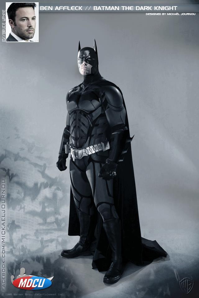 Fan-arts ou dessins préparatoires pour le film ça nous donne déjà une bonne idée de Ben Affleck en chauve-souris. Et personnellement je trouve qu'il a de l'allure, physiquement ça peut le faire. Sinon le logo couleur Or c'est assez bizarre pour Batman qui arbore une garde-robe plus sobre, mais je trouve qu'il est quand même cool, ça change, et s'il choisissaient ce logo et qu'il explique pour mettre de la couleur Or à Bruce je dis pourquoi pas. J'apprécie autant le costume Gris/Noir (qui est selon LA direction à prendre) que le Gris/Or pour jouer l'originalité. Le seul bémol reste l'armure qui fait très Nolan quand même, mais en même temps Batou sera dos à dos à un Clark Kent/Kal-El version Man Of Steel survitaminé je lui accorde qu'il à le droit de mettre des protège-tibias :D