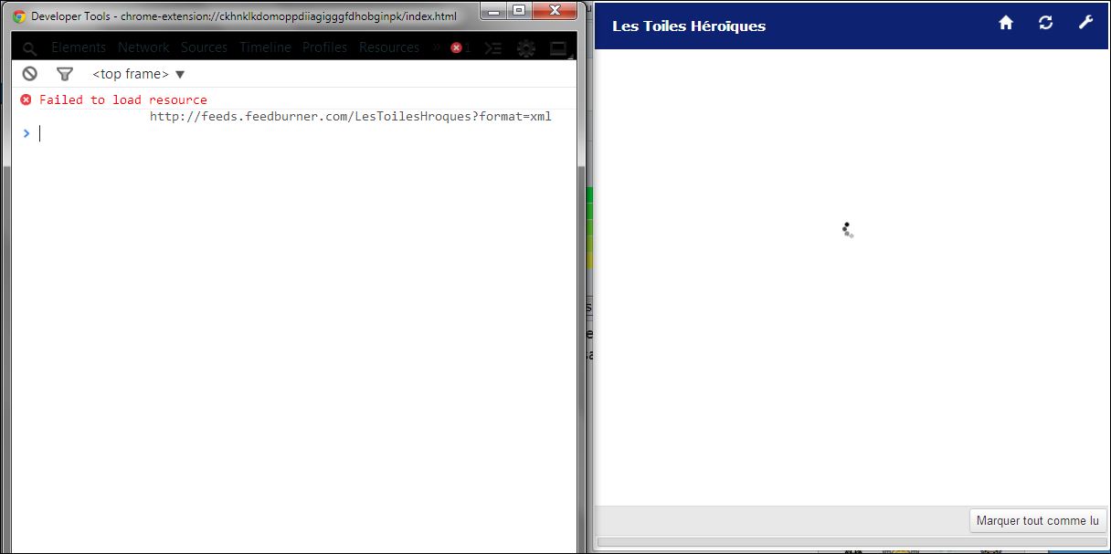 Et oui, dans le pop-up, quand je clique sur http://feeds.feedburner.com/LesToilesHroques?format=xml cela m'ouvre la page. Mais pour l'extension, rien ne s'affiche, il n'y a toujours que l'icône de chargement qui tourne.. et tourne.. et tourne...