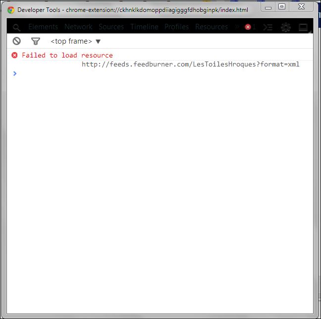 Et oui, dans le pop-up, quand je clique sur http://feeds.feedburner.com/LesToilesHroques?format=xml cela m'ouvre la page. Mais pour l'extension, rien ne s'affiche, il n'y a toujours que l'icône de chargement qui tourne.. et tourne.. et tourne...