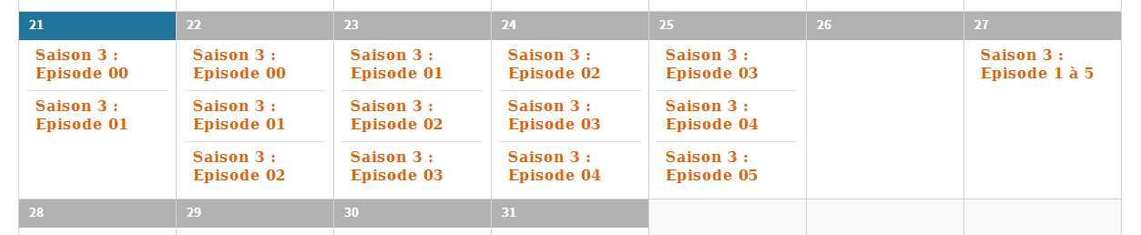 Ensuite, à partir du mardi, ce sera de 20h20 à 20h25 de nouveau l'épi 00, puis les épis 01 et 02 dans la foulée. Et ainsi de suite, mercredi les 01, 02 et 03, le jeudi les 02, 03 et 04, le vendredi les 03, 04 et 05 et enfin le dimanche la rediffusion des épis 01 à 05.