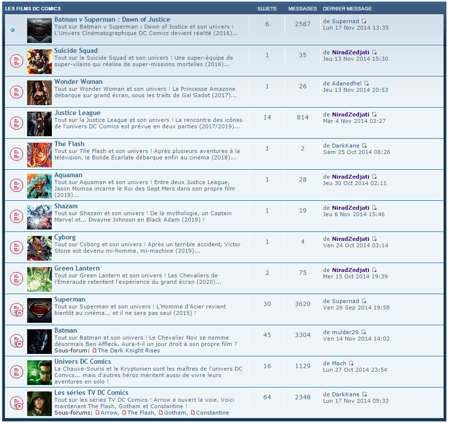 Mach a écrit:Serait-il possible d'avoir un forum un peu moins pro-Marvel ? Je veux dire par là que sur la page d'accueil du forum il y a 15 sous-sections dans Les Films Marvel et seulement 5 pour Les Films DC Comics.