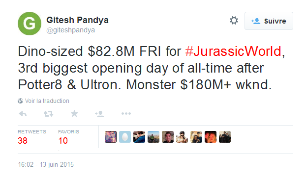 Gitesh Pandya sur Twitter - -Dino-sized $82.8M FRI for #JurassicWorld, 3rd biggest opening day of all-time after Potter8 & Ultron. Monster $180M+ wknd.- 2015-06-13 15-51-51.png