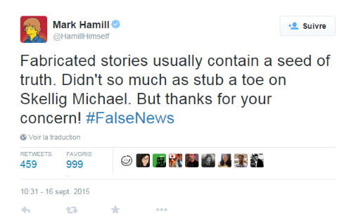 "D'habitude, les histoires inventées contiennent un peu de vérité. Je ne me suis même pas cogné un orteil sur Skellig Michael. Mais merci de vous être inquiété ! #FausseInfo"