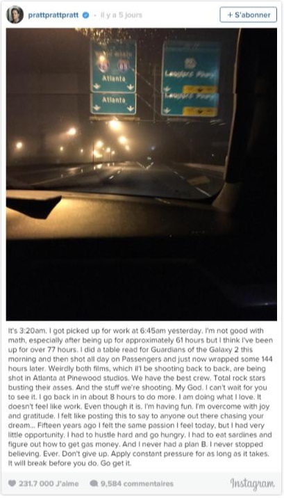 (pour la trad') TL a écrit:"Il est 3h20 du matin. On est venu me chercher à 6h45 hier pour que j'aille travailler. Je ne suis pas bon en maths - surtout après avoir été debout depuis 61 heures, mais je crois que je suis réveillé depuis plus de 77 heures. J'ai participé à une lecture du scénario des Gardiens de la Galaxie 2 ce matin puis j'ai passé la journée sur le tournage de Passengers. Bizarrement, les deux films, que je vais tourner l'un après l'autre, sont filmés à Atlanta dans les studios Pinewood. Nous avons la meilleure des équipes. Des vraies rock stars qui se bougent le cul. Et ce qu'on filme. Mon Dieu. J'ai hâte que vous voyiez ça. J'y retourne dans 8 heures environ. Je fais ce que j'aime. Je n'ai pas l'impression de travailler. Je suis submergé de joie et de gratitude. J'ai eu envie de poster ça pour vous dire à tous de poursuivre vos rêves... Il y a quinze ans, j'étais aussi passionné qu'aujourd'hui mais je n'avais que très peu d'opportunités. J'ai dû m'accrocher et j'ai eu faim. J'ai dû manger des sardines et trouver un moyen de mettre de l'essence dans ma voiture. Et je n'ai jamais eu de plan B. Je n'ai jamais cessé d'y croire. Jamais. N'abandonnez pas. Continuez d'insister autant qu'il le faudra. Ça cédera avant vous. Allez-y, faites-le".
