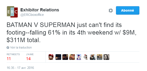 Ben dans les déclarations du PDG de Warner, on sent clairement qu'ils pensent déjà à "après" BvS. Je veux dire, pour eux, ça va aller vite je pense, entre la sortie de "Suicide Squad" qui sera lié à"BvS" vu que ça s'imbrique aussi dans le DC Universe et les ventes DVD/Blu-Ray de "BvS", d'ici la sortie de "Wonder Woman" et "Justice League", les deux films devraient rentrer dans leurs frais.
