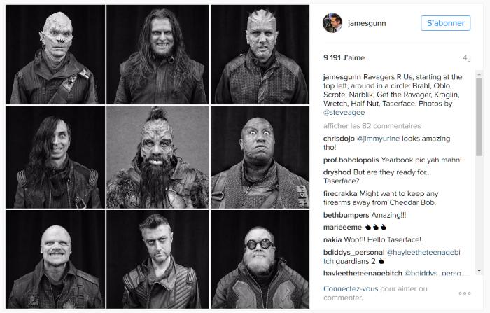 James Gunn sur Instagram - Ravagers R Us, starting at the top left, around in a circle- Brahl, Oblo, Scrote, Narblik, Gef the Ravager, Kraglin, Wretch, Half-Nut, Taserface  Photos by @steveagee.jpg