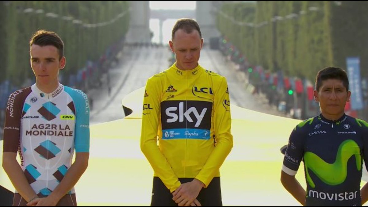 Froome remporte son 3éme Tour, Bardet est 2éme, Quintana 3éme. Aussi les 4 maillots distinctifs en image avec Sagan, Froome, Yates et Majka. #TDF2016