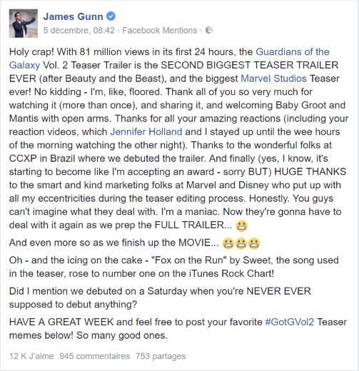 EagleWolf a écrit:James Gunn a commenté le score du nombre de vues du teaser :