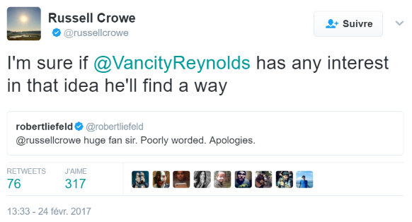 Russell Crowe sur Twitter - -I'm sure if @VancityReynolds has any interest in that idea he'll find a way https---t co-KFUC6fIxjS-.jpg