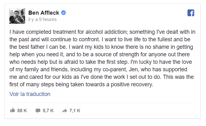 Ca c'est l'aspect personnel, ou Affleck dit justement qu'il vient de remporter une bataille contre ses démons intérieurs...et EW affrime que ça n'a pas affecté plus que ça son implication professionnelle.