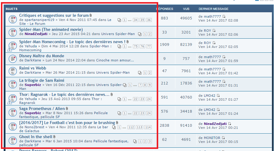 math7777 a écrit:En plus de l'heure et de la dernière personne à avoir posté dans la colonne "dernier message" c'est possible de rajouter le nom du topic? Pour pouvoir directement s'y connecter.