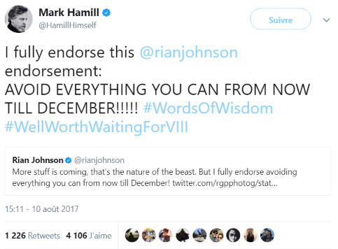 Mark Hamill sur Twitter - -I fully endorse this @rianjohnson endorsement- AVOID EVERYTHING YOU CAN FROM NOW TILL DECEMBER!!!!!.jpg
