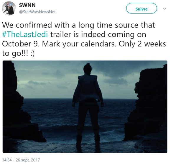 SWNN sur Twitter - -We confirmed with a long time source that #TheLastJedi trailer is indeed coming on October 9.jpg
