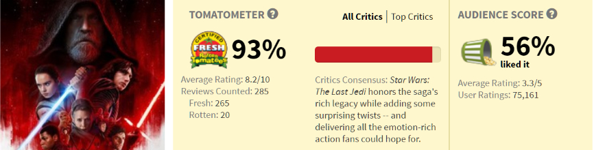Il y un raid de trolls organisé depuis 4Chan et d'autres plateformes pour que le pourcentage du film descende le plus bas possible... :roll: