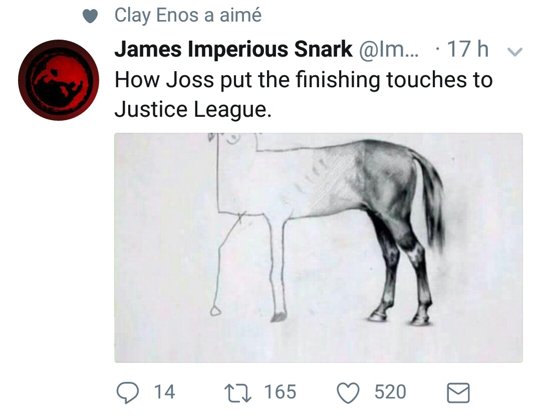 C'est assez drôle, mais je trouve que Whedon est une cible peut être trop facile. Son boulot n'était pas évident, dans de sales conditions et suivant des directives douteuses de DC (film moins sombre, 2H max...). On lui a demandé de compléter le boulot d'un réalisateur dont le style lui est diamétralement opposé. Son erreur a surtout été d'accepter le job ou n'avoir pas obtenu un report de sortie du film. ET je ne pense pas non plus que les aspects techniques du film (CGI, moustache...) soient totalement de sa faute.