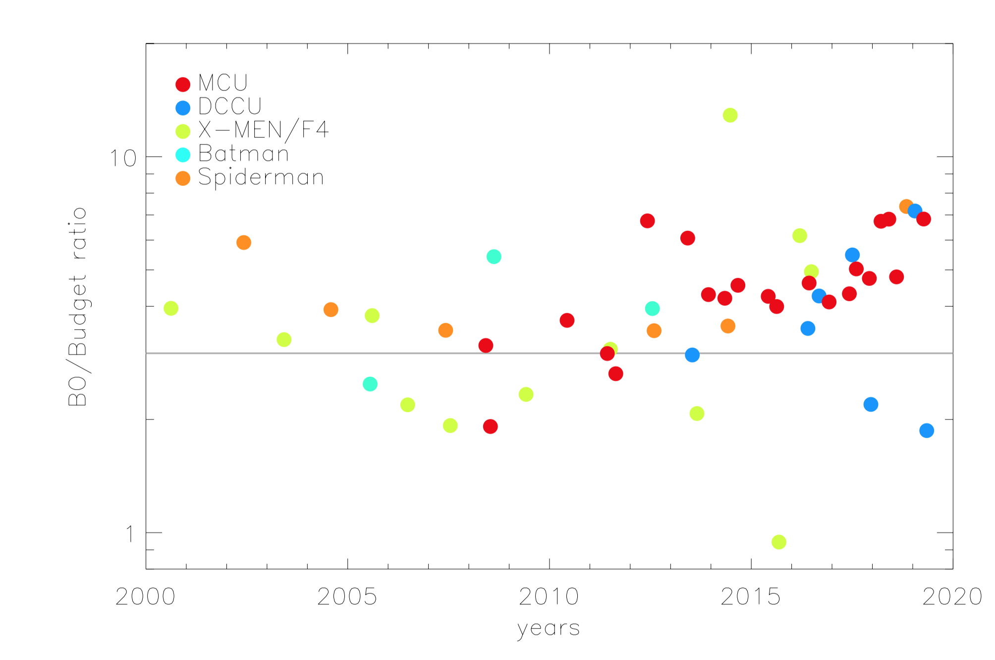 J'ai mis une ligne horizontale pour un rapport BO/Budget ~3 qui est l'objectif à atteindre pour les films de SH modernes (ont peut dire qu'avant l'explosion du MCU avec Avengers ce chiffre était plutôt de ~2.5.
