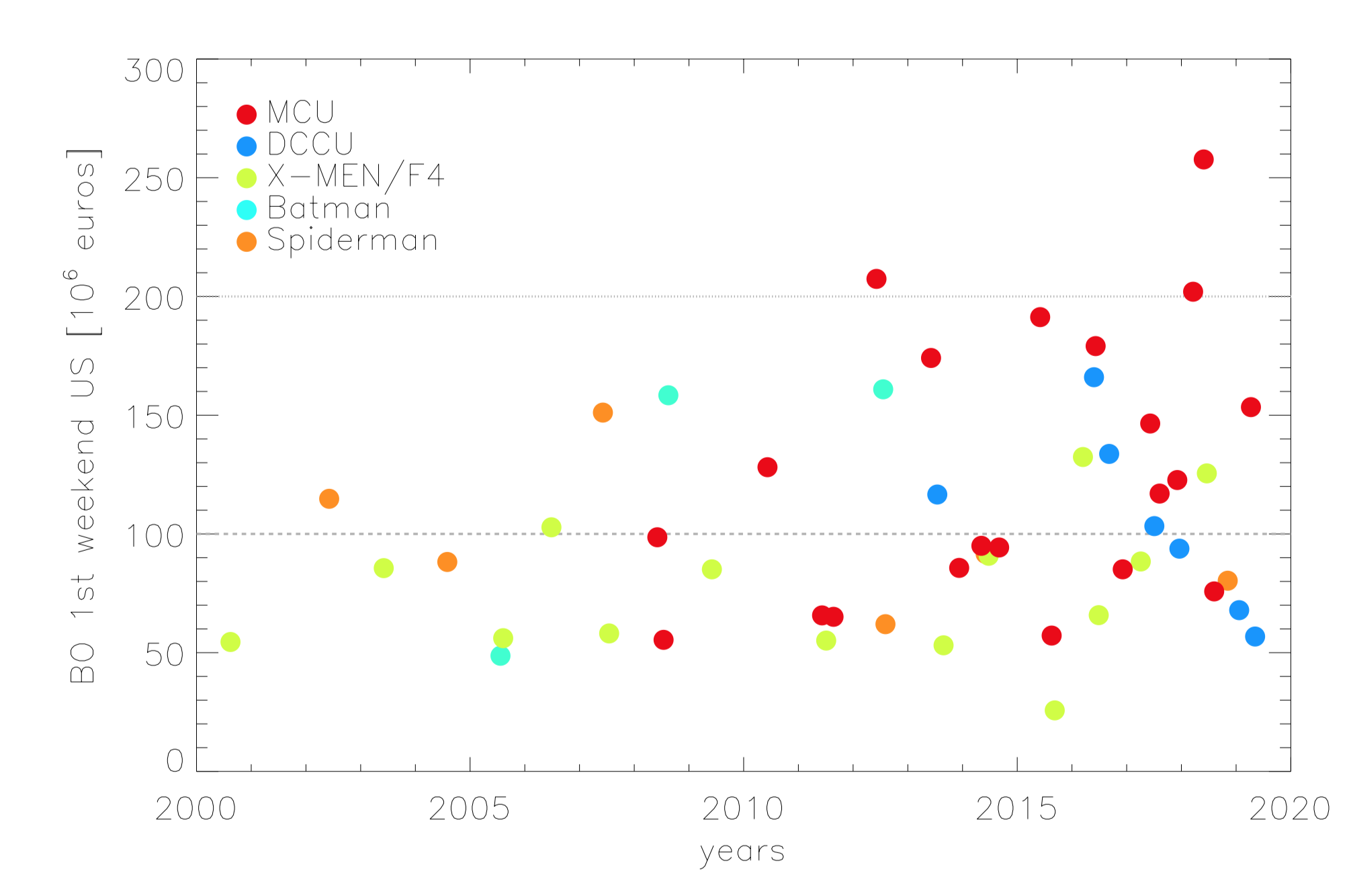 Voici donc la première figure (Les chiffres sont en dollars et non en euros contrairement à ce qui est écrit sur la figure), qui montre le BO-monde réalisé par les film SH concernés en fonction de leur date de sortie (ce qui devrait vous permettre de retrouver à quel film correspond chaque point). Ne faites pas attention au dernier point bleu, c'est Shazam (qui est encore en tout début d'exploitation).