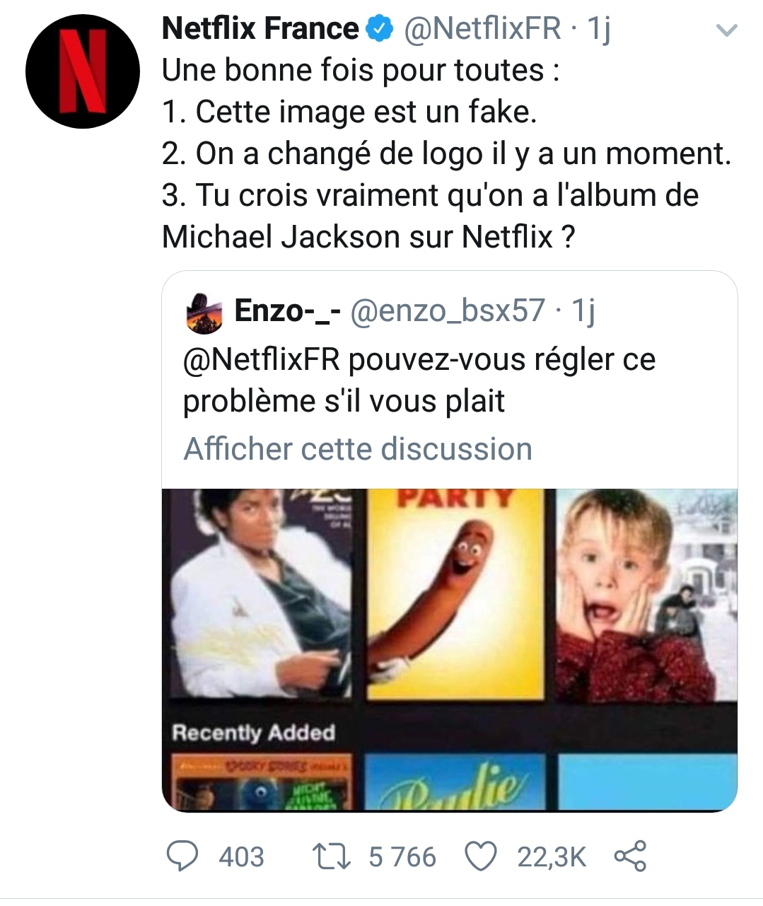 ROY a écrit:Non mais attends @Niffleur, le CM Netflix FR est un des plus drôles de Twitter ... Le point #3 de ce tweet le prouve une nouvelle fois. Tu as vraiment une interprétation étrange des choses à chaque fois quand même.Là le CM fait juste taire la rumeur avec un trait d'humour.