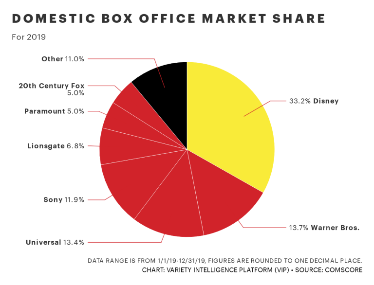 Pour Disney-Fox c'est cool, on est pile dans la fourchette de 35 à 40% de parts de marché que j'estimais il y a un peu plus de 9 mois :D Belle remontée de Lionsgate (du simple au double par rapport à 2018 et leur malheureux 3%) même s'ils ne sont pas encore revenus à leurs niveaux d'antan (8% en 2017, 9.7% en 2013, 11.5% en 2012). Par contre le grand perdant de cette année c'est la Paramount qui a enchaîné les flops (Wonder Park, Gemini Man, Terminator: Dark Fate, etc.) et dont les quelques succès (What Men Want, Pet Sematary, Rocketman, Crawl ou encore Dora) étaient de trop petite envergure pour compenser...