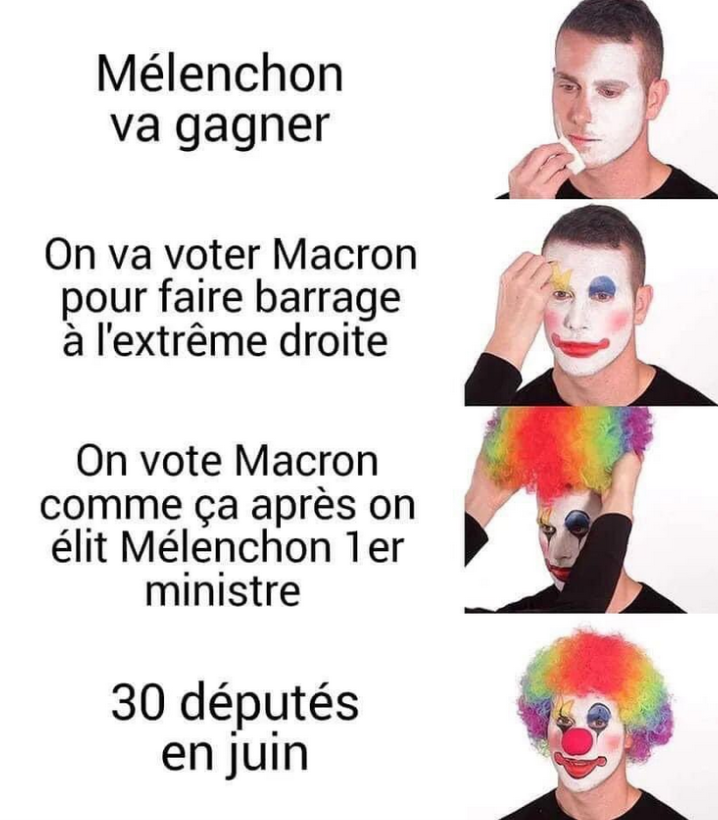 (ça diabolise la blonde alors que Macron applique déjà tout son programme, comme si les dernières 5 années s'étaient envolé magiquement, c'est fou comme on peut manipuler les gens en moins de 2 semaines avec quelques phrases qui font peur et quelques posts insta.... Le vrai barrage, il était au premier tour, tant pis pour vous.)