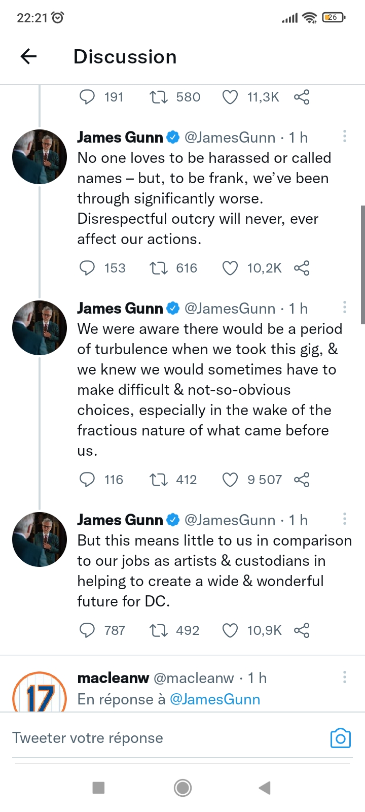 NiradZedjati a écrit:Non perso' je pense qu'il dit/répond explicitement "à ceux qui disent que je vais recaster tout le monde sauf ma Suicide Squad; c'est faux !".