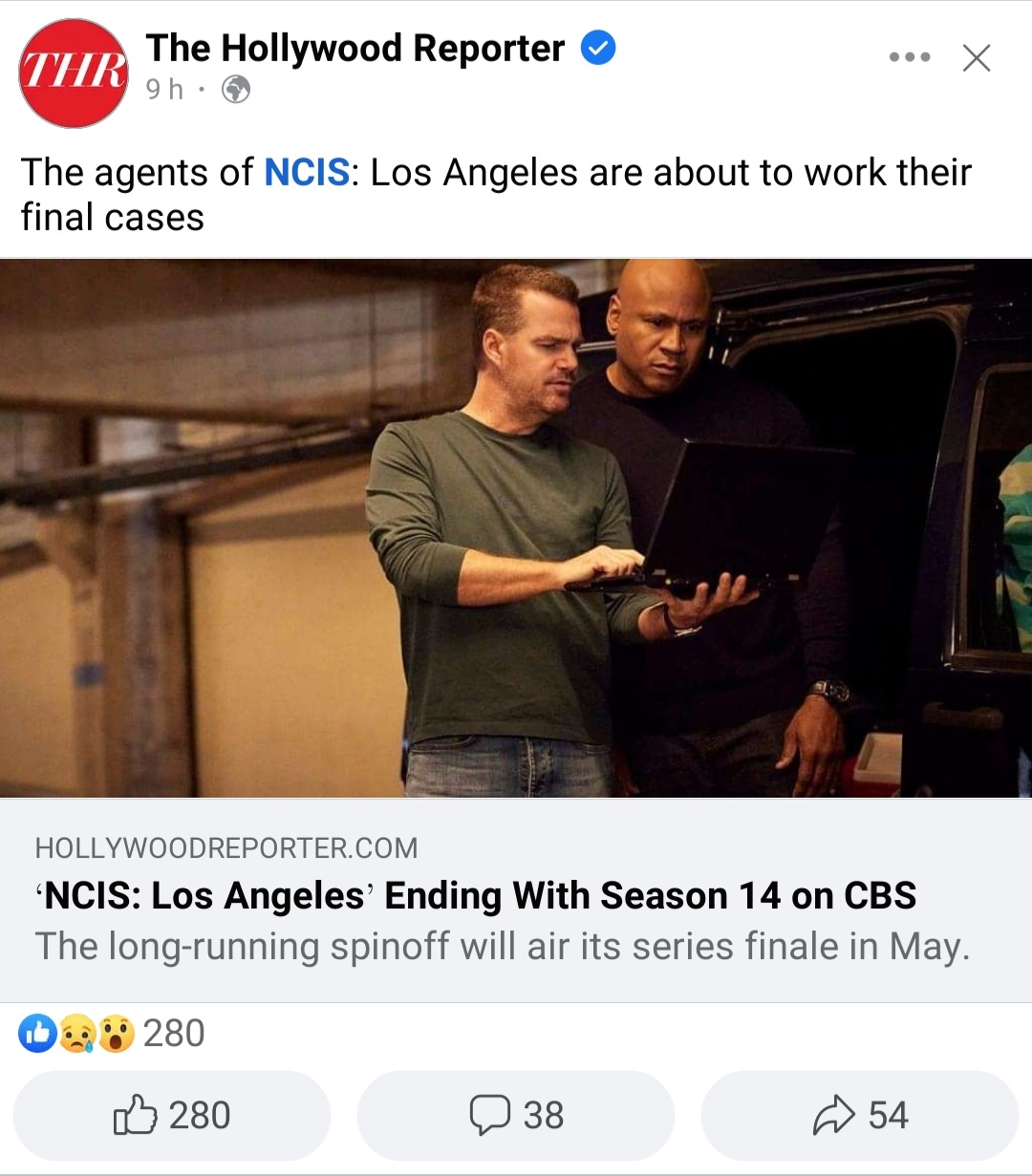 Et ouais, mauvaise nouvelle pour NCIS Los Angeles qui va s'arrêter avec cette 14ème saison en cours ^^'.. à cause d'une audience en basse (-15 % par rapport à la 13ème saison). Les acteurs et l'équipe ne l'ont appris que hier :paf: :