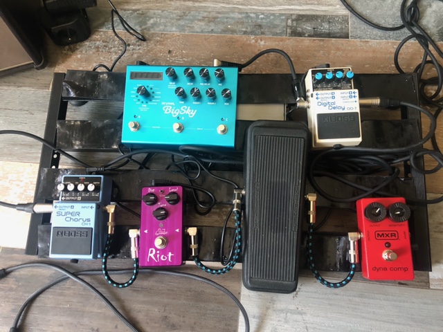 Cela donne: guitare-comp Dyna MXR- Whawha-Suhr riot- chorus CH-delay DD7-big sky -ampli