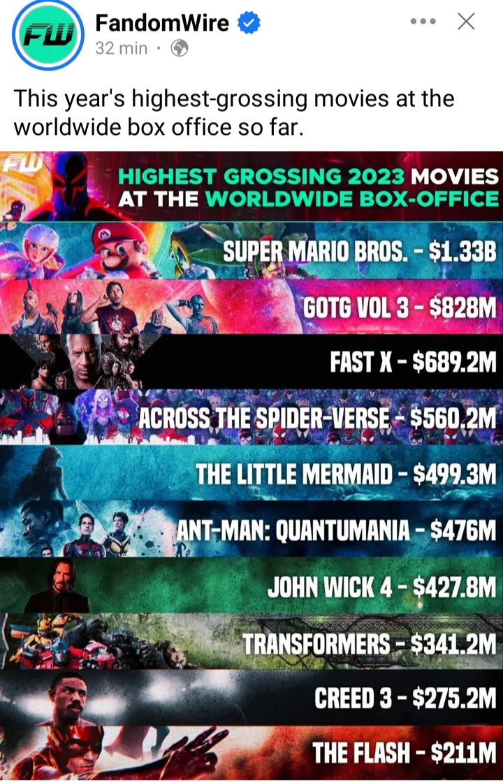 Espérons que ça remonte lors du second semestre grâce à Indiana Jones, Mission Impossible, Barbie, Oppenheimer, The Meg, Blue Beetle, Expendables, Dune, The Marvels ou encore Aquaman ! Il n'y en a que deux ou trois dans cette liste qui ont le potentiel d'atteindre le milliard donc ce sera pas la meilleure année pour le box office mais s'ils performent tous correctement ça sauvra au moins l'honneur pour 2023 :lol:
